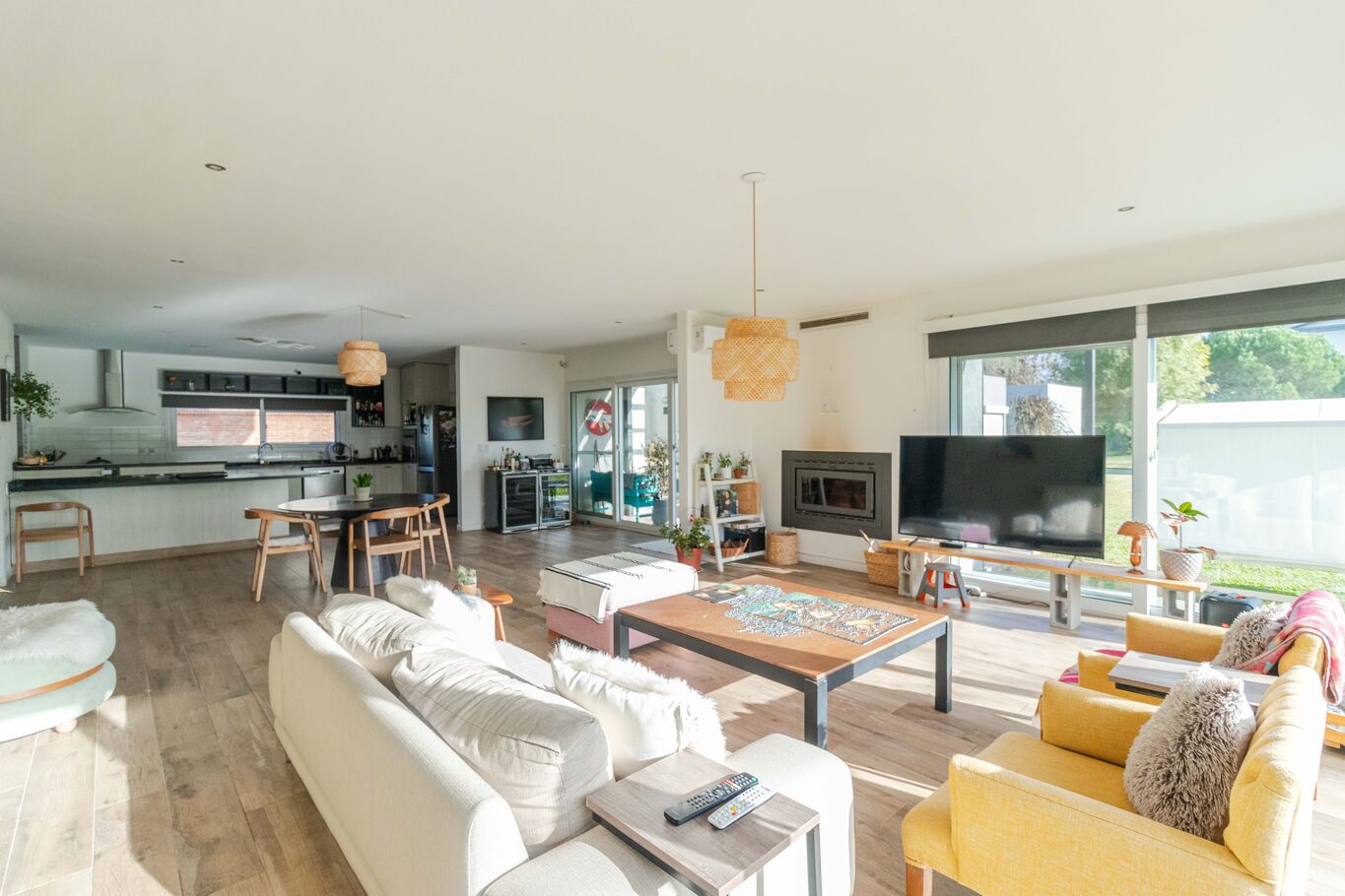 Al ingresar, nos recibe un amplio y elegante living–comedor con cocina integrada, conformando un ambiente moderno y luminoso, con grandes ventanales que se abren hacia un jardín de más de 1.000 m².