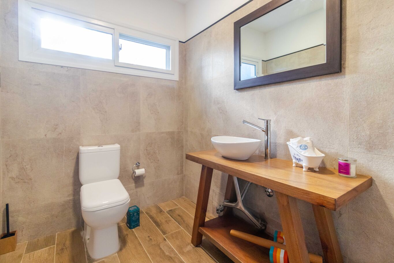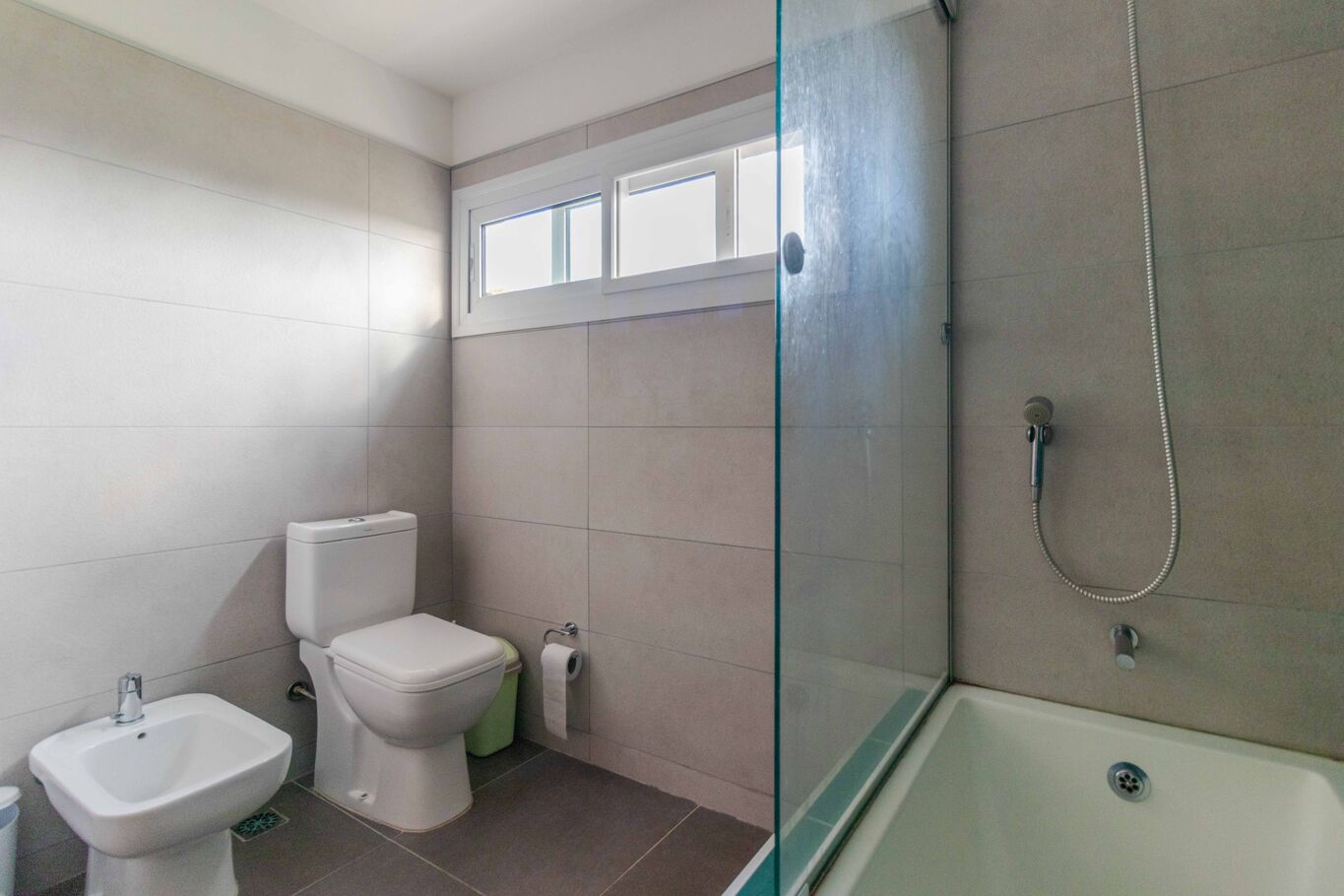 Los dormitorios secundarios comparten un amplio baño compartimentado, con doble acceso y doble bacha, brindando comodidad y privacidad.