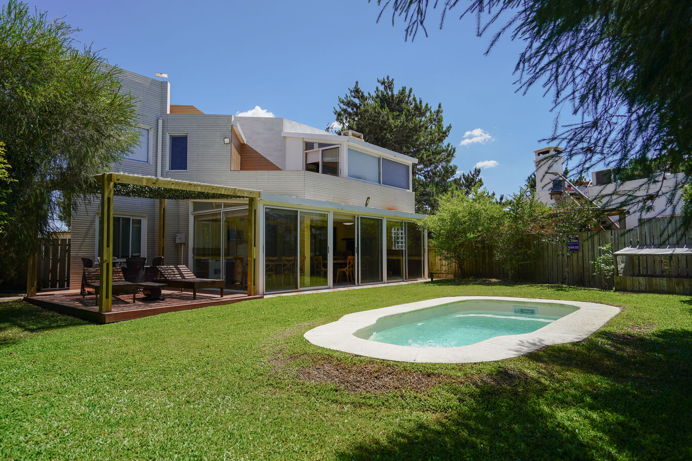 Dispone de living, estar y cocina definida, con ambientes bien proporcionados y luminosos. El parrillero cerrado se integra al uso diario de la casa y tiene salida directa al jardín, donde se encuentra una piscina, generando un espacio perfecto para el descanso y el disfrute al aire libre.