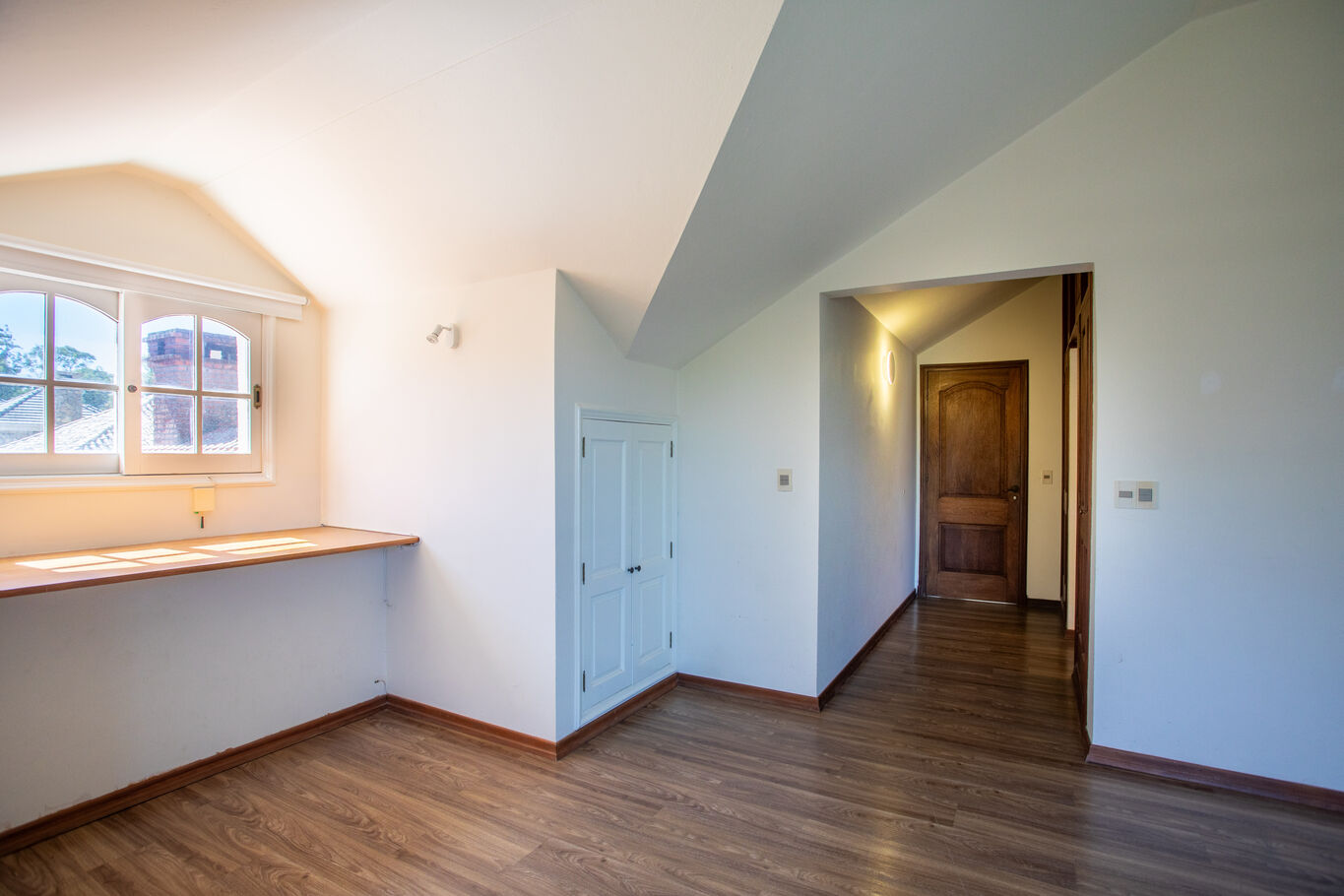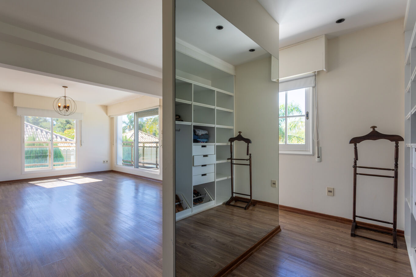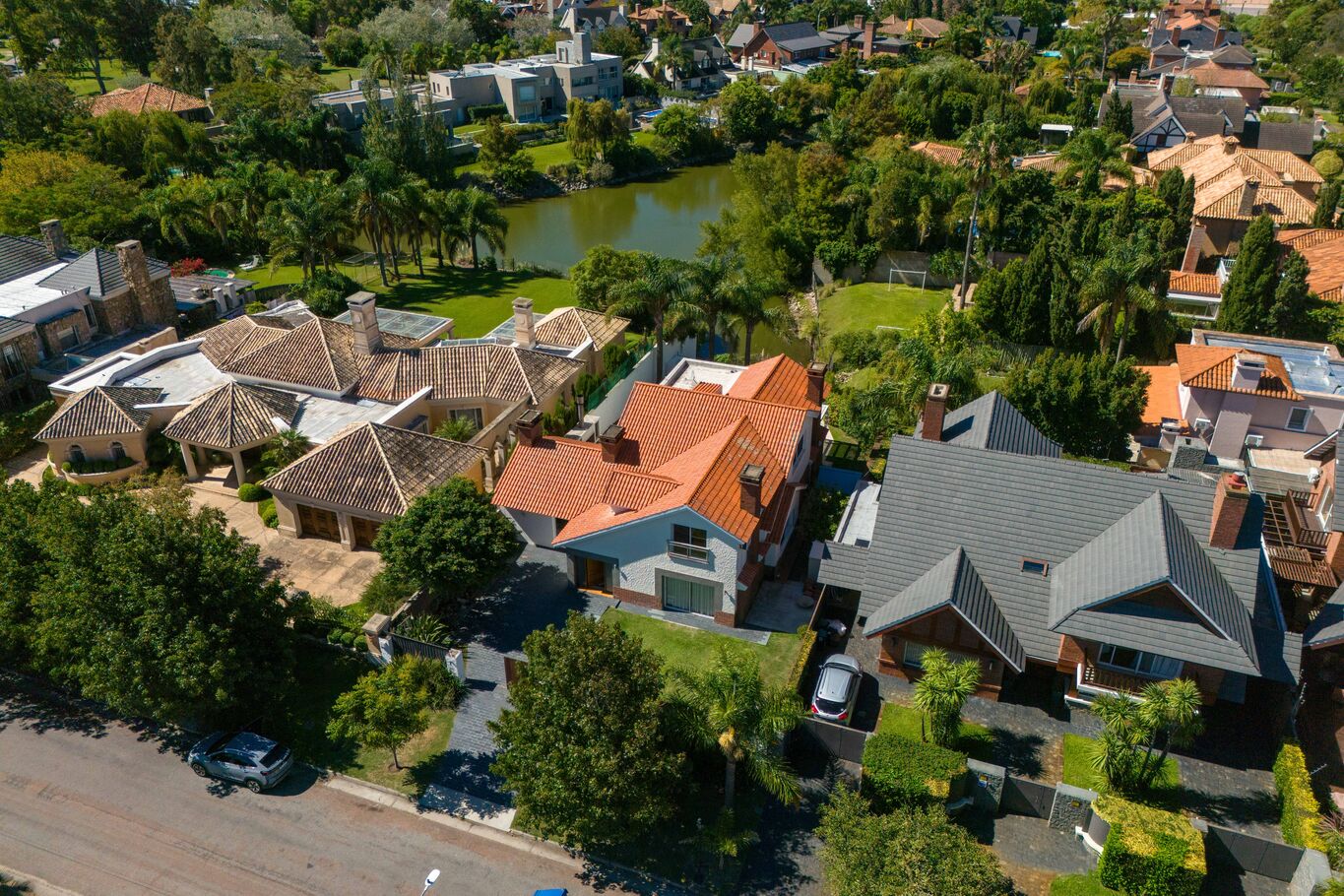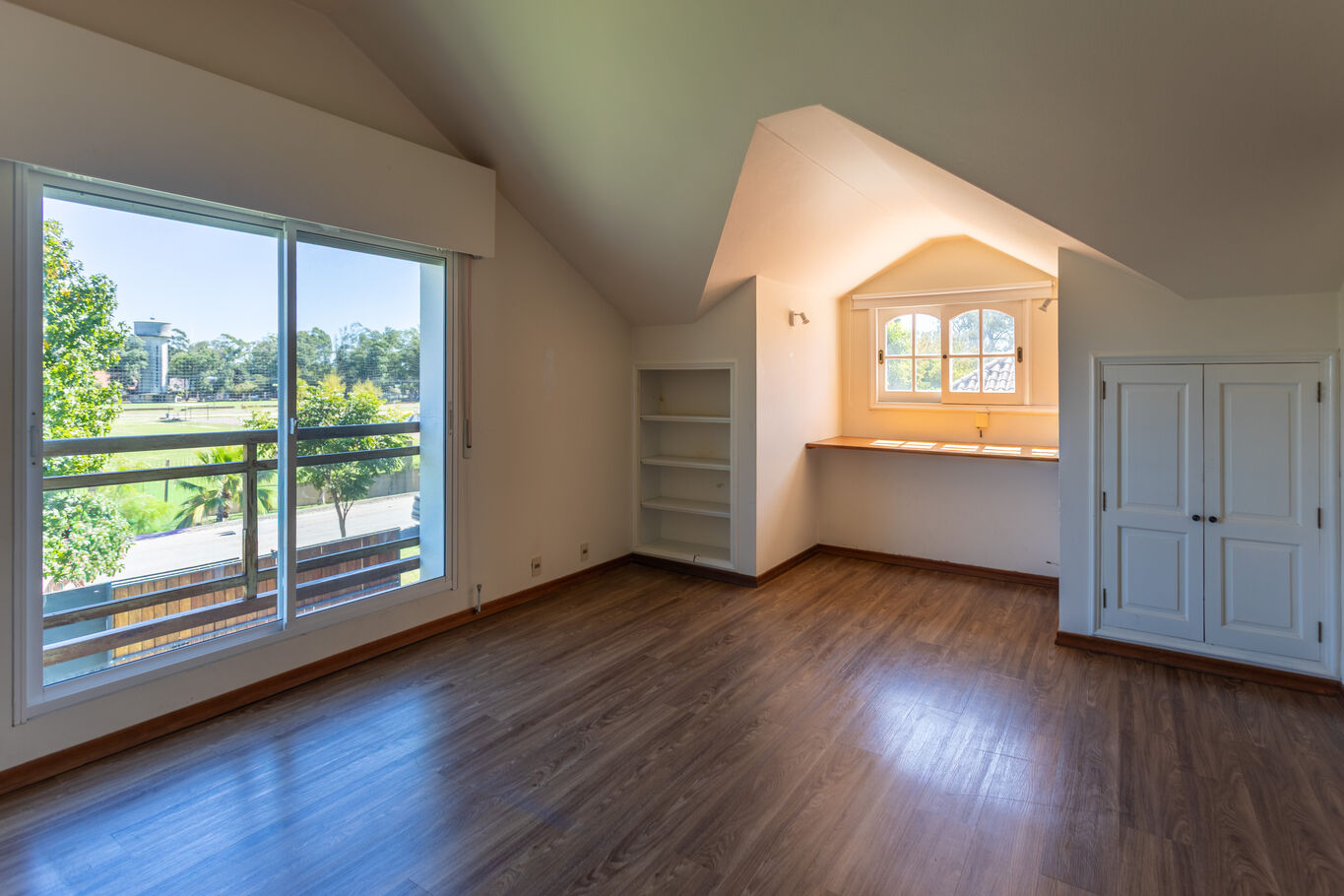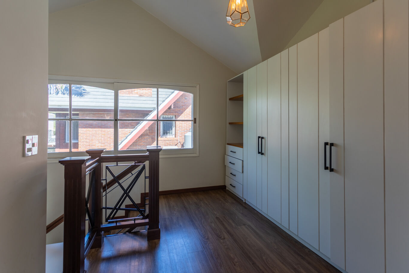 En planta alta, el sector íntimo se organiza en tres dormitorios, dos de ellos en suite. La suite principal incorpora vestidor y una vista abierta al lago que aporta una sensación de calma permanente.