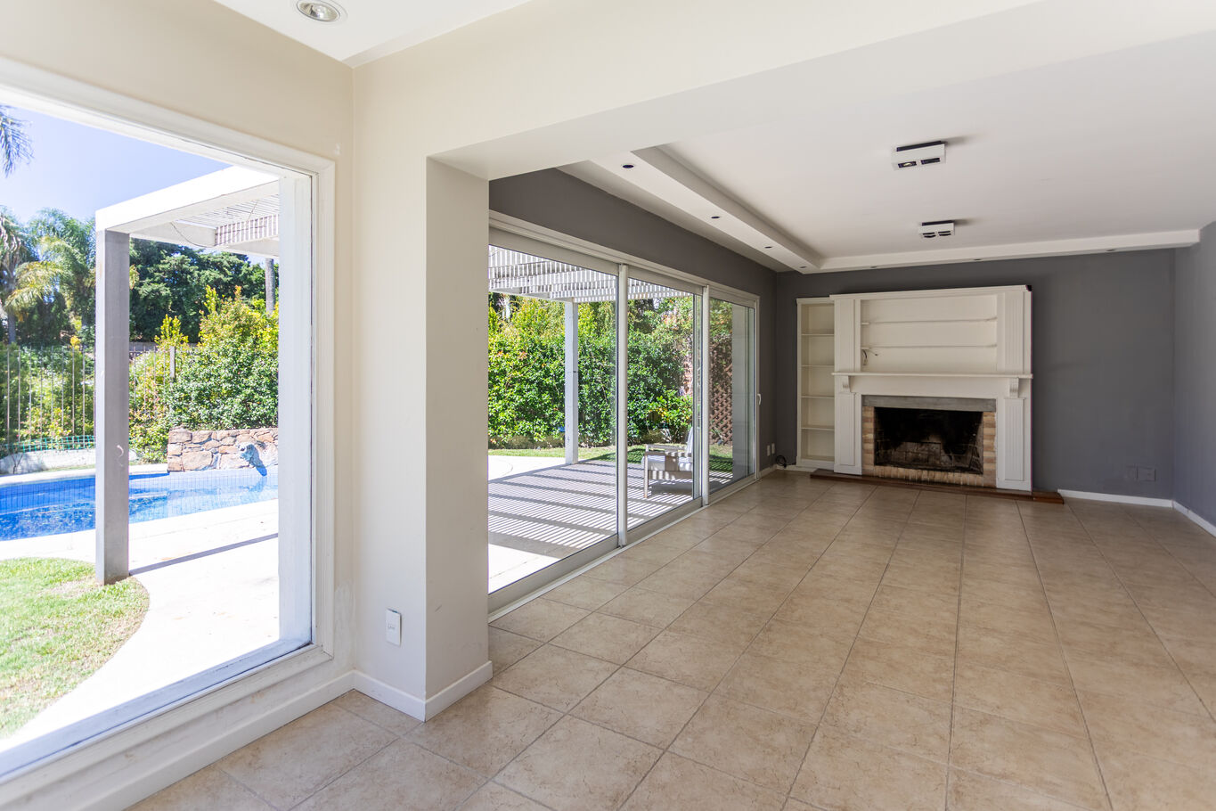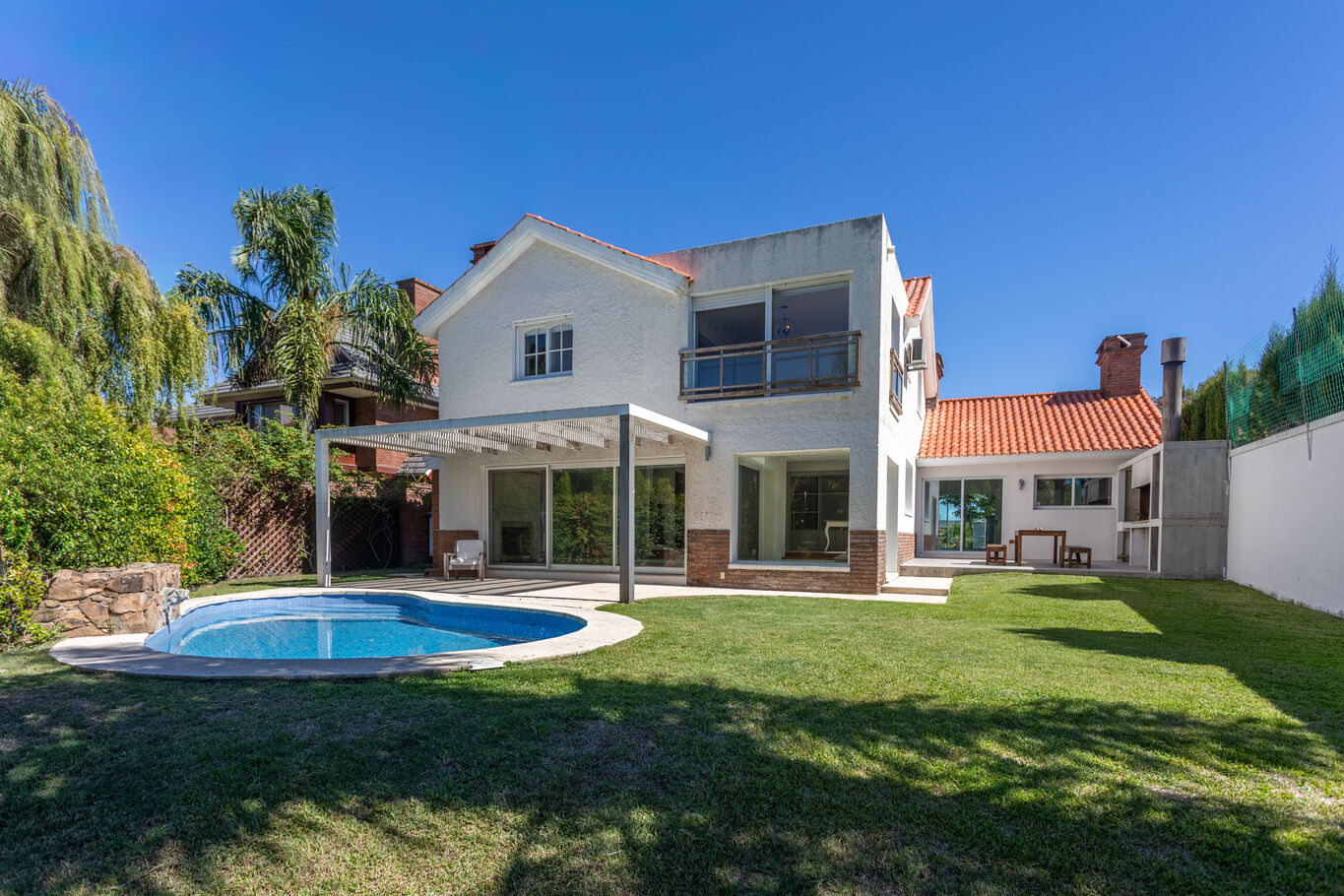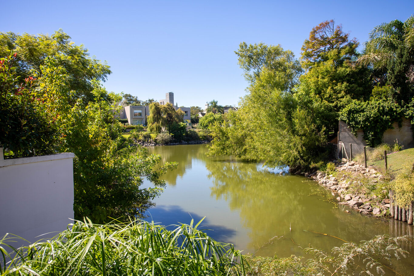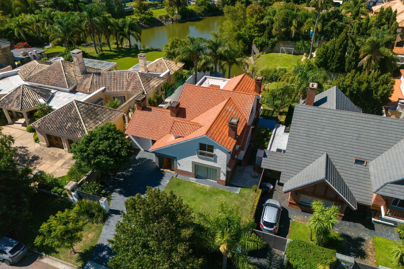 una galería techada que extiende la casa hacia el jardín, piscina y un entorno verde consolidado, con acceso directo al lago, generando un marco único para el día a día.