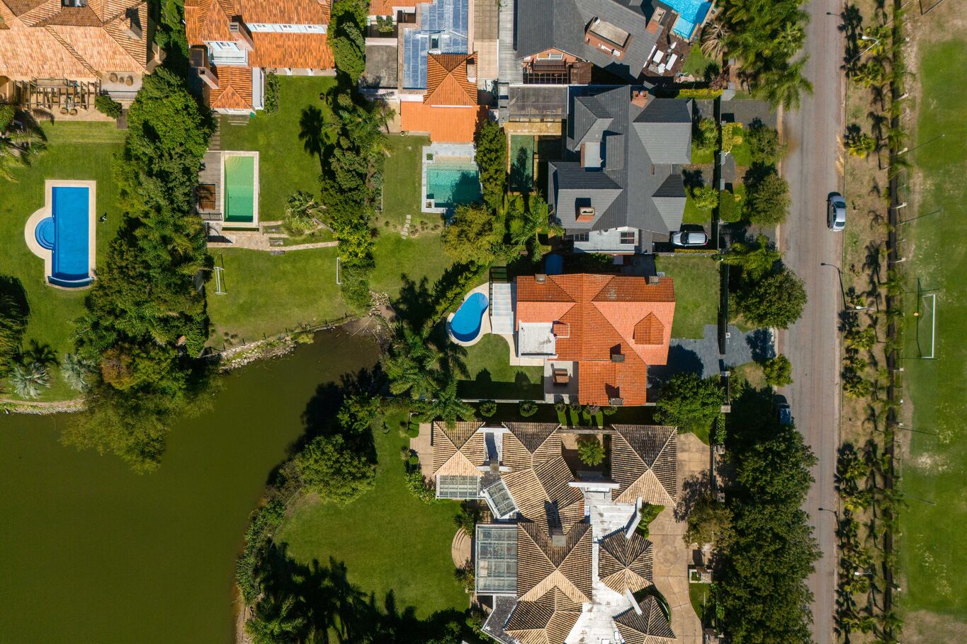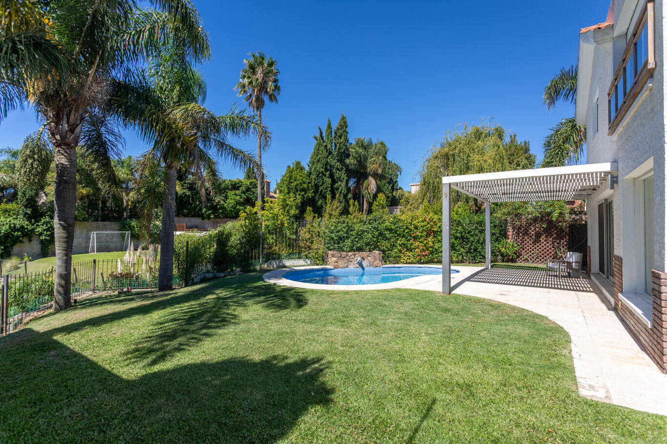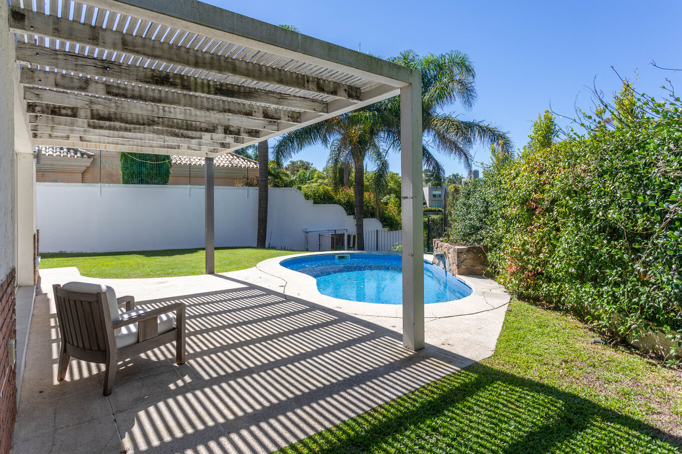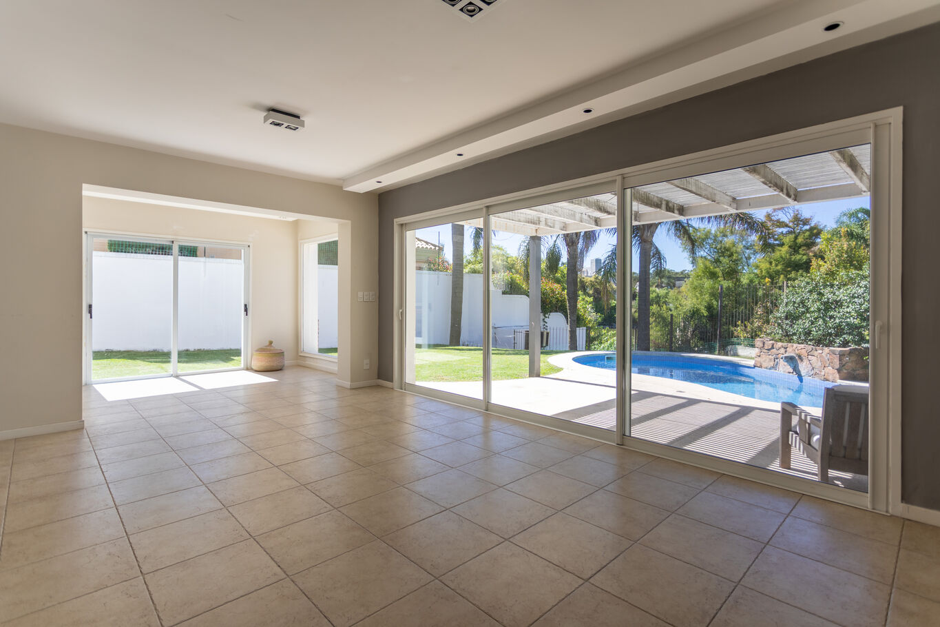 una galería techada que extiende la casa hacia el jardín, piscina y un entorno verde consolidado, con acceso directo al lago, generando un marco único para el día a día.
