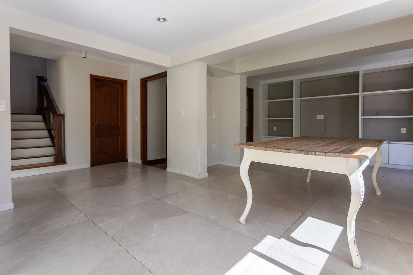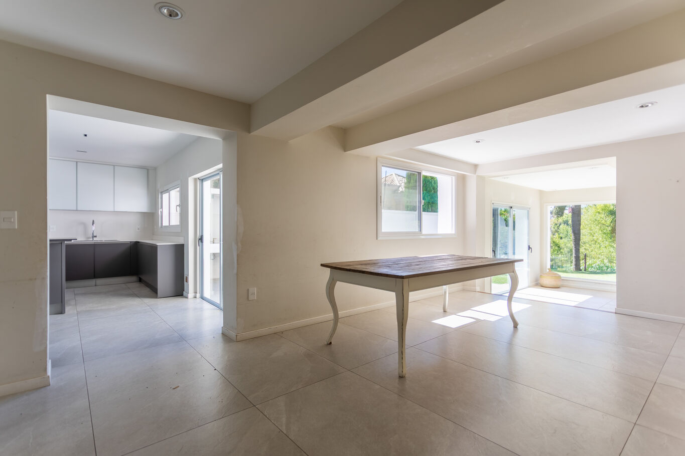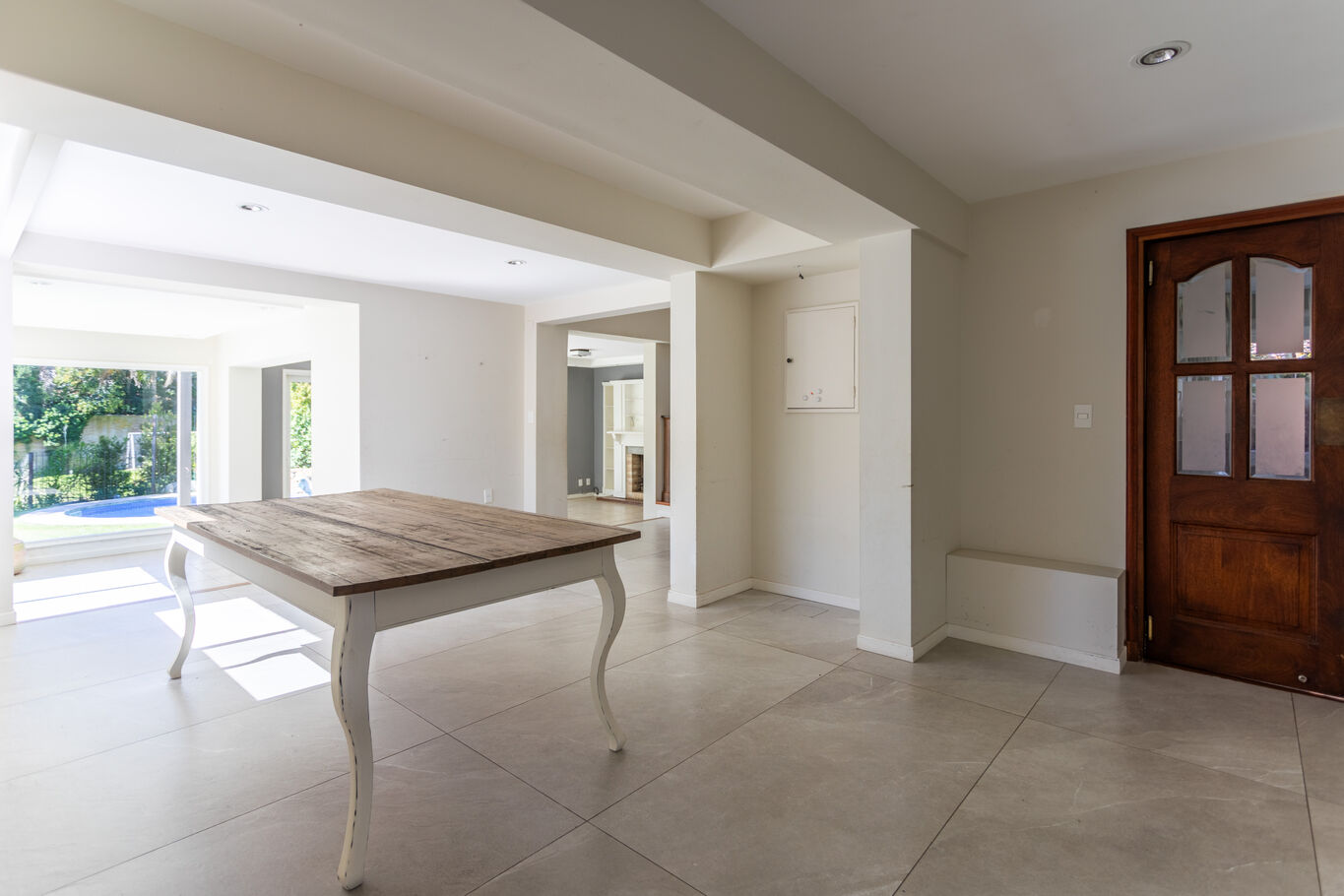 Desde el ingreso, un hall de recepción ordena los espacios y da paso a un living principal con estufa a leña, cálido y luminoso, conectado al comedor. Hacia el fondo, el área social se abre completamente al exterior a través de grandes ventanales, integrando el estar diario con la galería, el jardín y la piscina.
